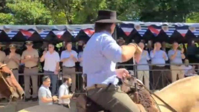 Un momento destacado de la celebración ocurrió cuando el exmandatario participó de la marcha ecuestre. Al pasar frente al estrado oficial, donde se encontraban las autoridades, Lacalle Pou ejecutó el característico gesto de cortesía gaucha: inclinó ligeramente la cabeza y llevó el pulgar y el índice de su mano derecha al ala de su sombrero.